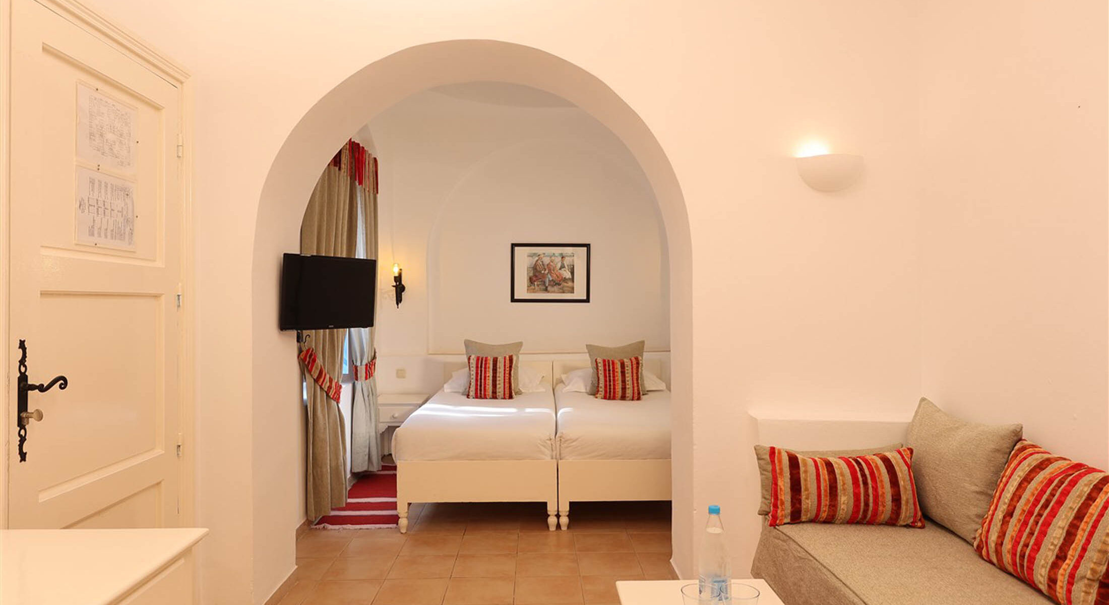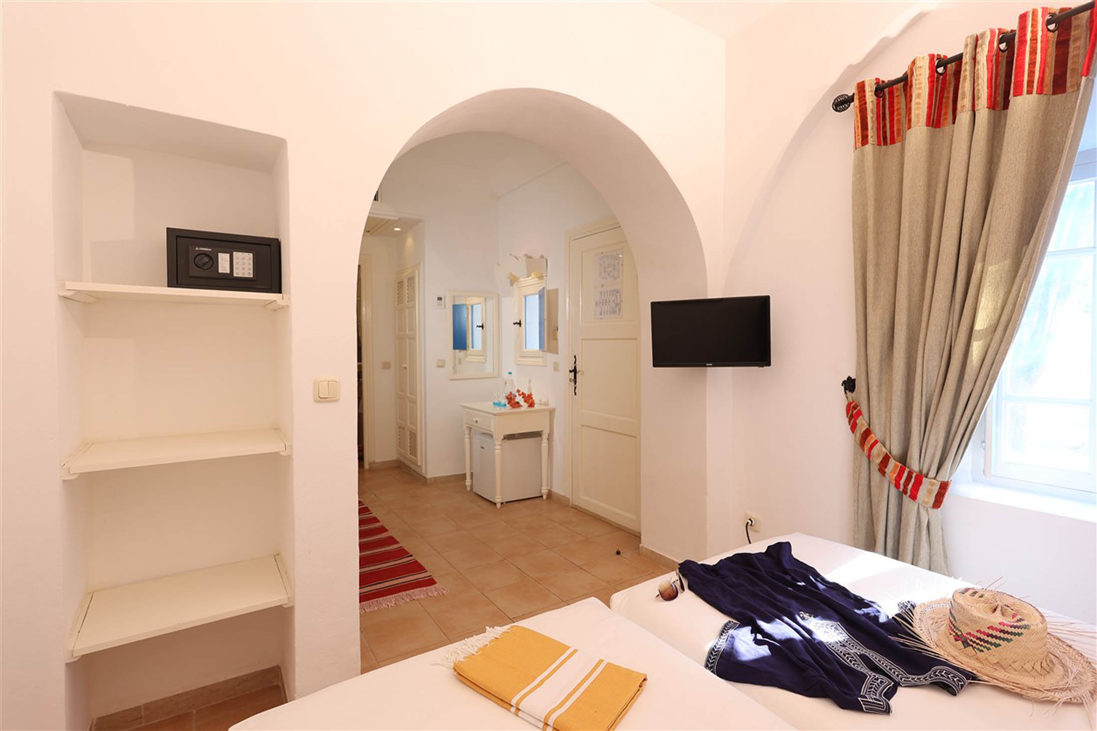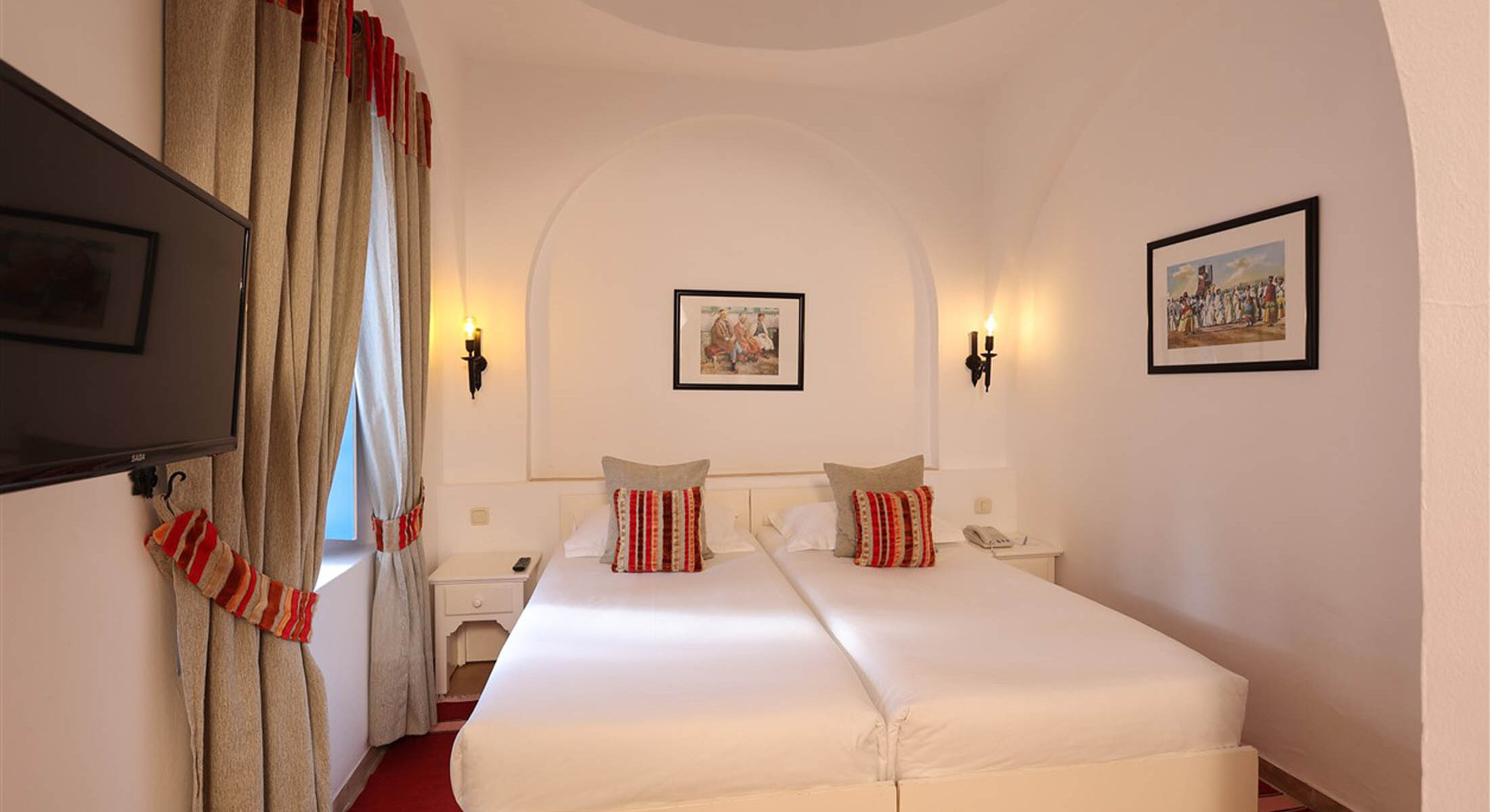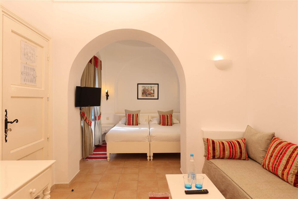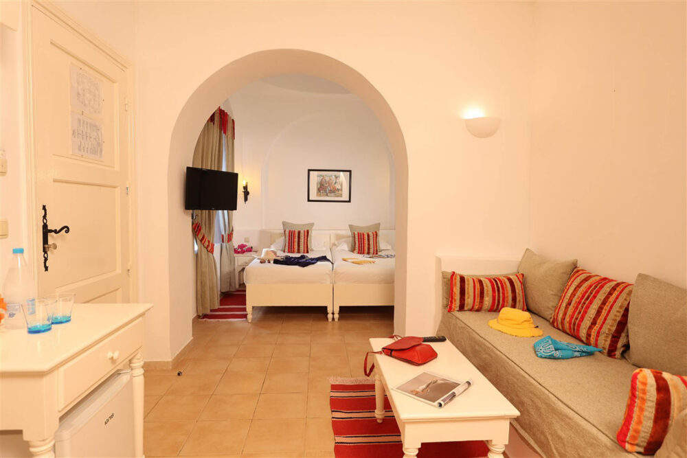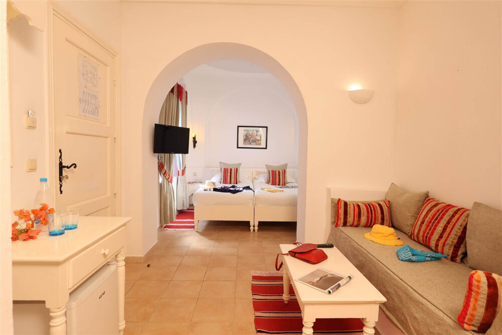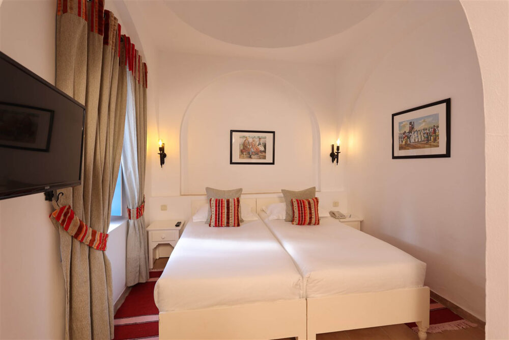 Dans une architecture typiquement locale, inspirée du style Menzel et du décor djerbien traditionnel, posez vos valises dans l’une des chambres triples du Royal Karthago. D’une superficie d’environ 18 m², ces chambres offrent un espace agréable pour partager un séjour entre amis ou en famille, dans une ambiance méditerranéenne lumineuse et conviviale. Fidèle au charme du sud tunisien, la décoration mêle couleurs chaudes et matériaux naturels, avec quelques touches de bois et de pierre inspirées de l’artisanat local.