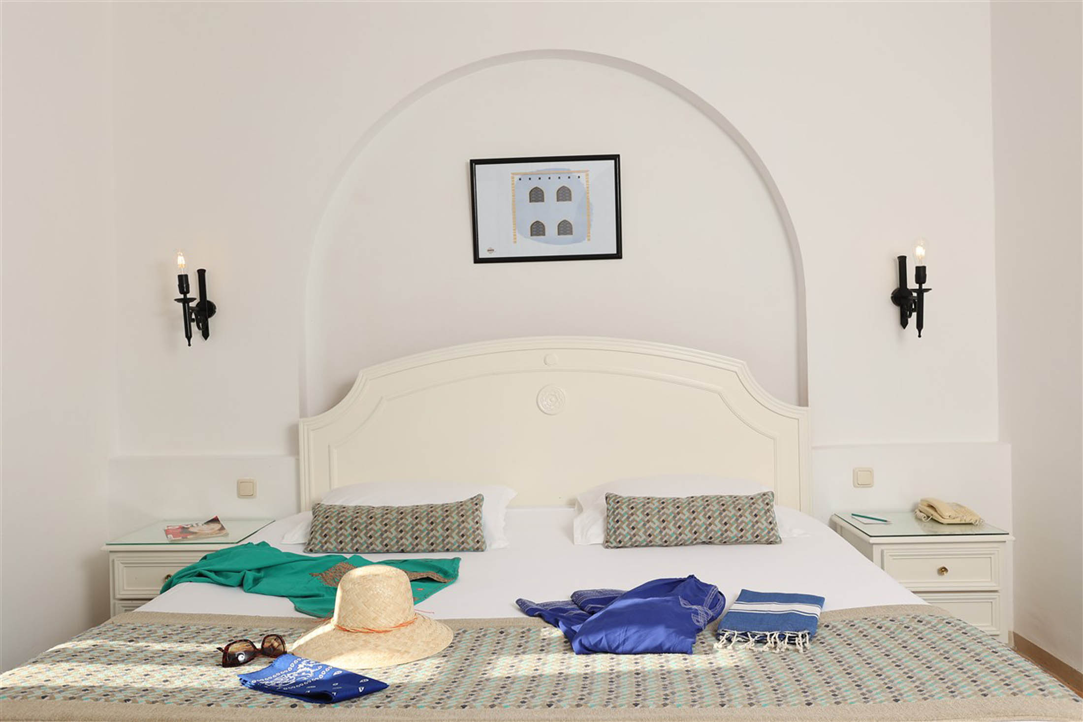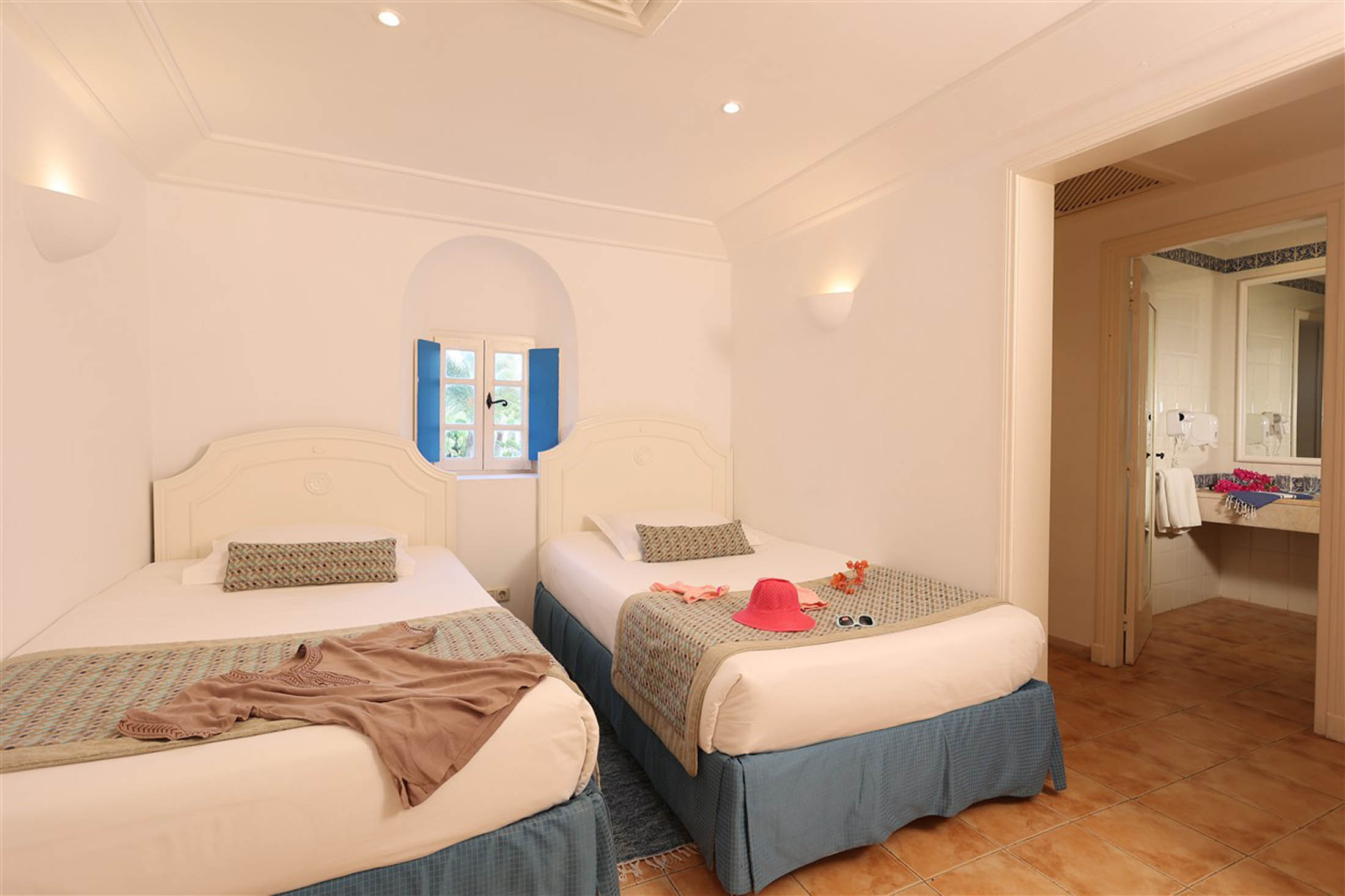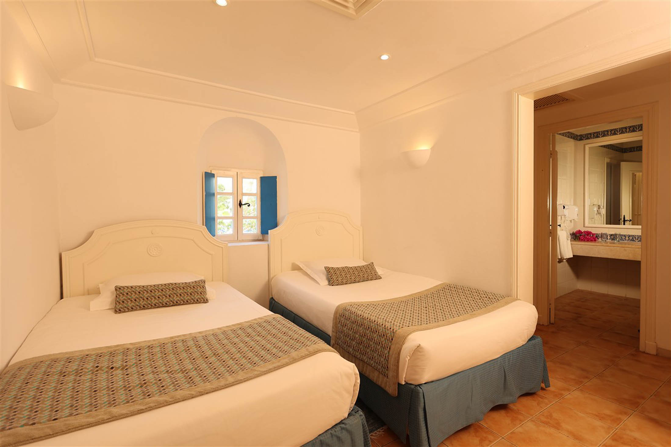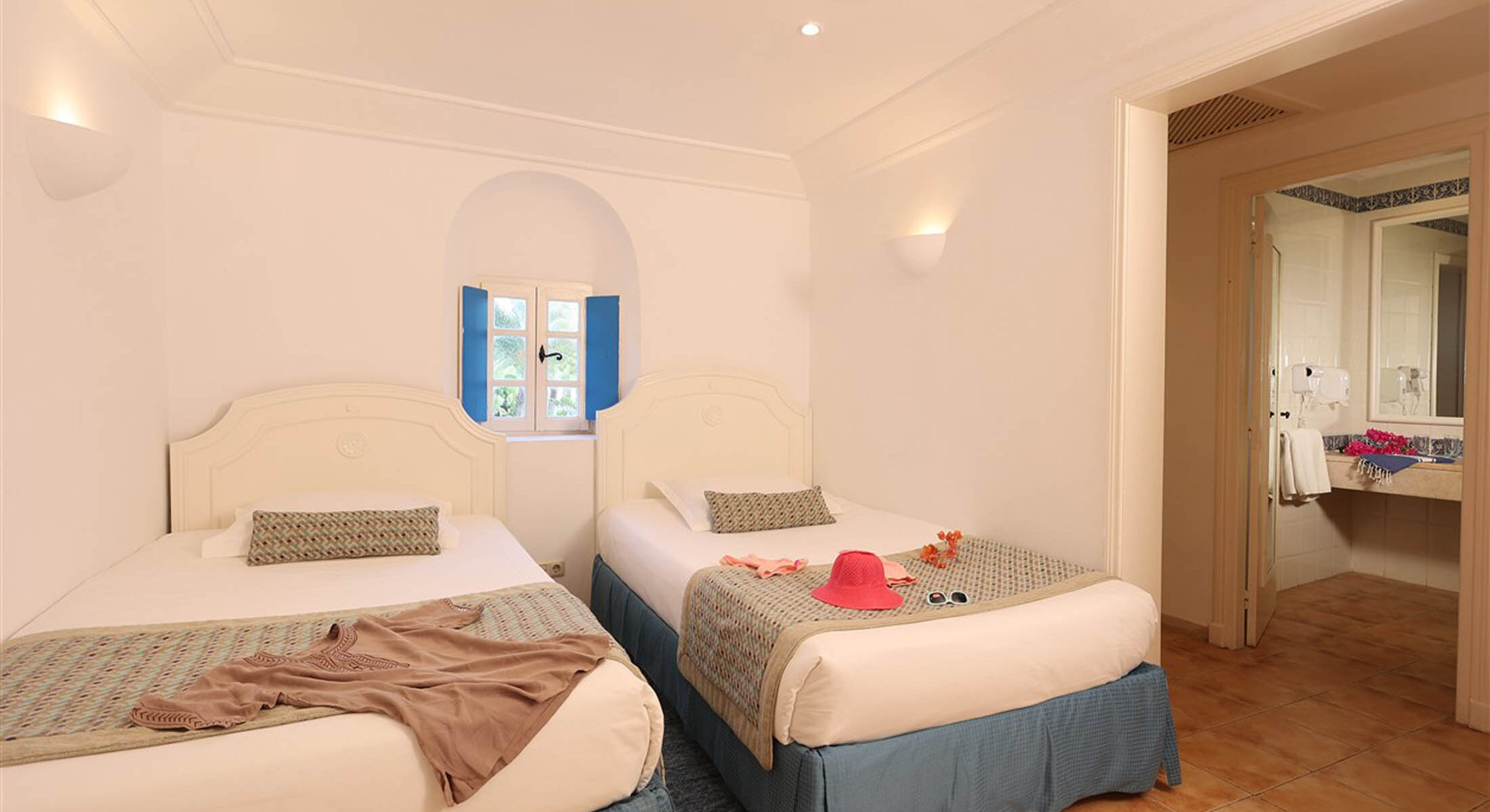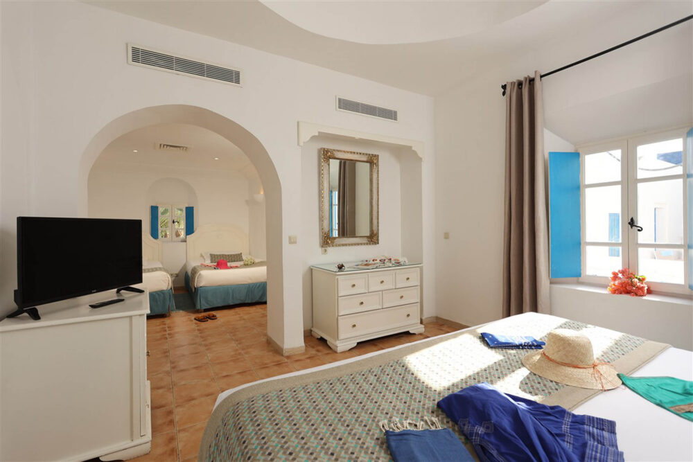 Dans une architecture typiquement locale, inspirée du style Menzel et du décor djerbien traditionnel, posez vos valises dans l’une des chambres triples du Royal Karthago. D’une superficie d’environ 18 m², ces chambres offrent un espace agréable pour partager un séjour entre amis ou en famille, dans une ambiance méditerranéenne lumineuse et conviviale. Fidèle au charme du sud tunisien, la décoration mêle couleurs chaudes et matériaux naturels, avec quelques touches de bois et de pierre inspirées de l’artisanat local.