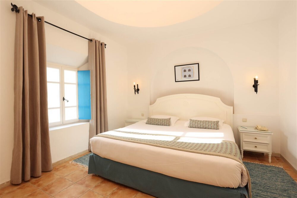 Idéale pour les séjours en famille, la chambre quadruple du Royal Karthago Thalasso & Spa permet d’accueillir jusqu’à 4 personnes dans un espace confortable optimisé pour les familles. Pour les parents, elle propose soit un grand lit (160x190 cm) soit deux lits simples (85x190 cm), complétés par deux lits superposés parfaits pour les enfants. Inspirées du style djerbien traditionnel, nos espaces privilégient les teintes douces et les éléments d’artisanat local, dans l’esprit authentique de l’île.