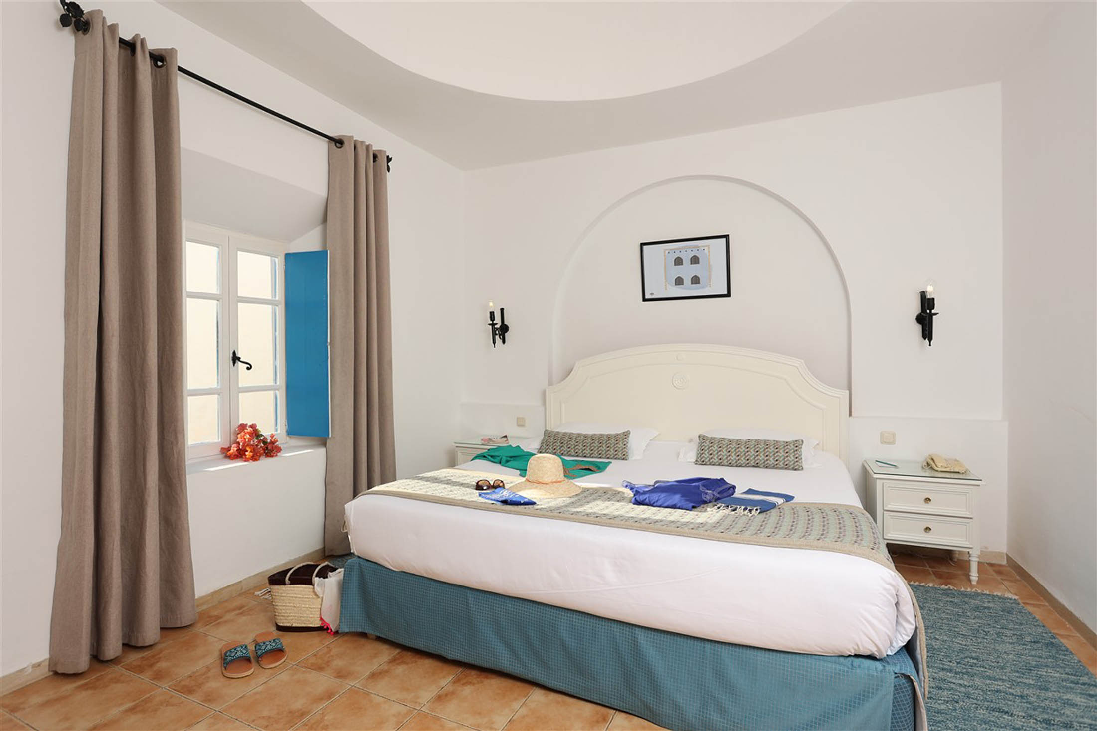 Dans ces espaces, le design s’inspire du style Menzel et du décor djerbien traditionnel. Une architecture authentique qui s’exprime à travers une esthétique locale mêlant couleurs chaudes, matériaux naturels comme le bois et la pierre, ainsi que des textiles locaux. Quelques objets artisanaux, luminaires typiques et motifs orientaux viennent souligner l’identité culturelle de l’île, dans une atmosphère méditerranéenne lumineuse et détendue. L’harmonie entre intérieur et extérieur renforce le caractère immersif du lieu.
