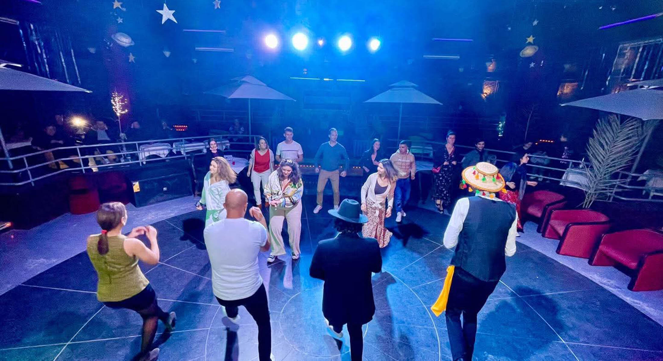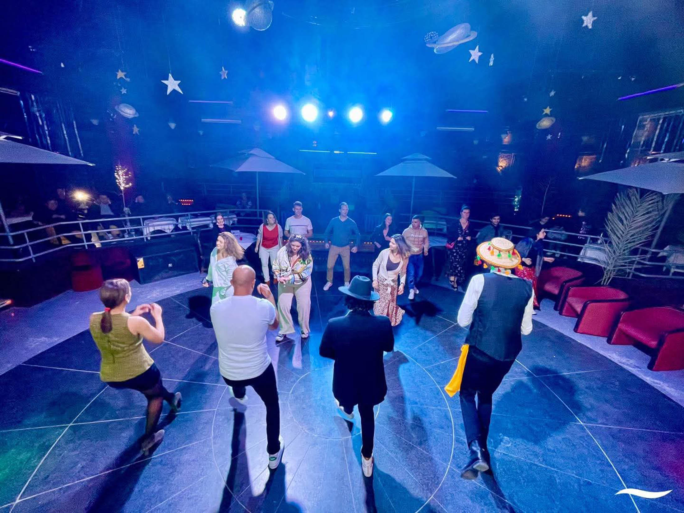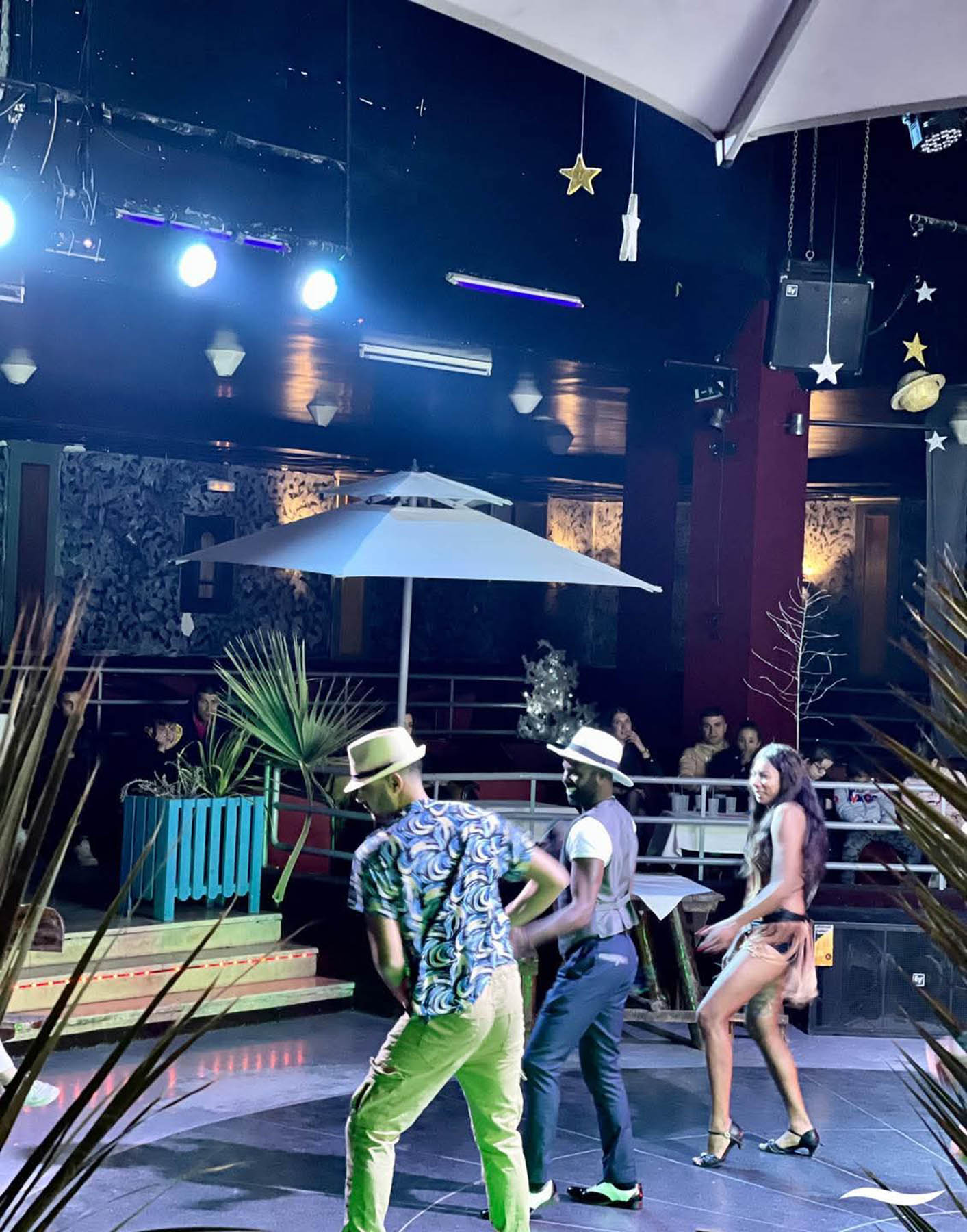 L’espace est harmonieusement agencé autour d’une piste de danse centrale surplombée d’une estrade, idéale pour les danseurs les plus avertis. Un espace salon chaleureux et un bar permettent de s’accorder une pause entre deux morceaux. Vous pourrez y savourer une large sélection de boissons locales, alcoolisées ou non, ainsi que des cocktails, des jus concentrés et de l’eau servie au verre, tout en profitant de l’énergie de la soirée.